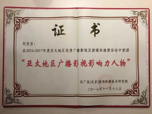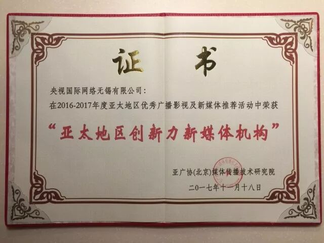 2017年12月18日—19日,2017亚太广播影视与新媒体创新大会在山西太原举行。来自中国、美国、柬埔寨、缅甸、泰国等国的影视业界高层及大咖300余人出席会议。会上,无锡市新媒体龙头企业央视国际网络无锡有限公司从500多家中外媒体机构及影视制作机构中脱颖而出,荣获“亚太地区创新力新媒体机构”大奖;公司总经理何京京同时获评“亚太地区广播影视影响力人物”。