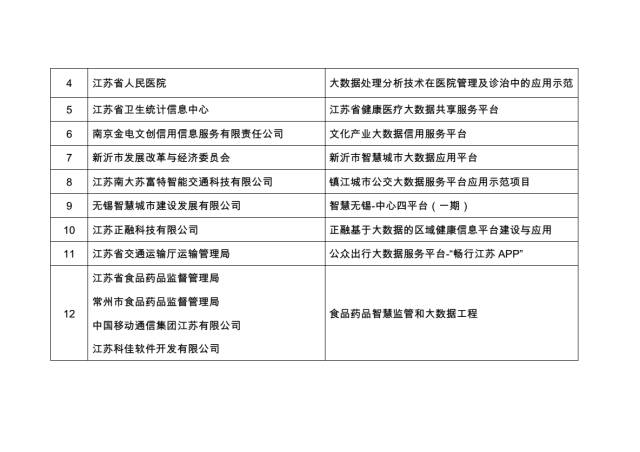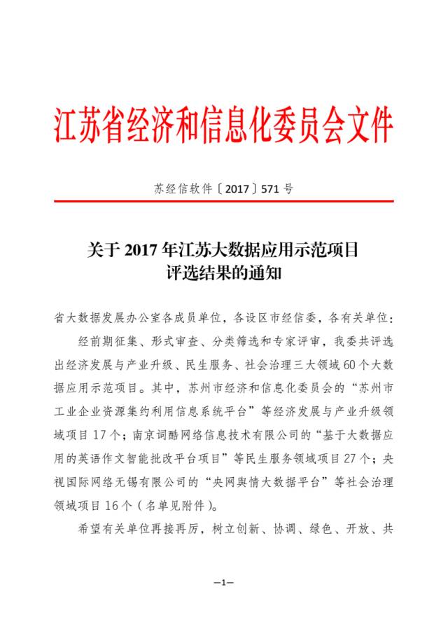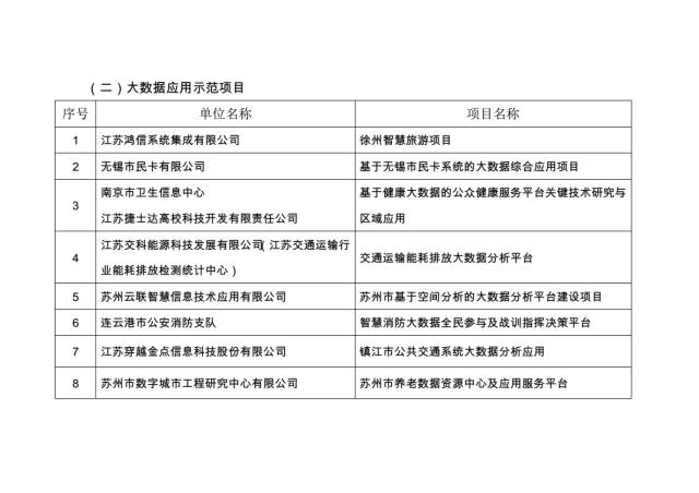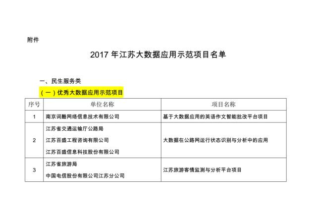 2017年8月8日,江苏省经济和信息化委员会发布了“2017年江苏省大数据应用示范项目评选结果”,经过经前期征集、形式审查、分类筛选和专家评审等多个环节,分别在经济发展与产业升级、民生服务、社会治理三大领域评选出60个大数据应用示范项目。
